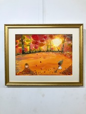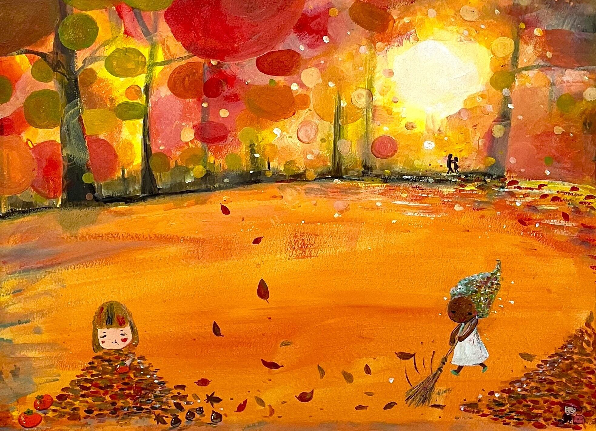 秋。落ち葉の中で遊ぶ楽しさ、紅葉の美しさや自然の豊かさを表現しています。季節に合わせてお部屋を彩ってはいかがでしょうか?