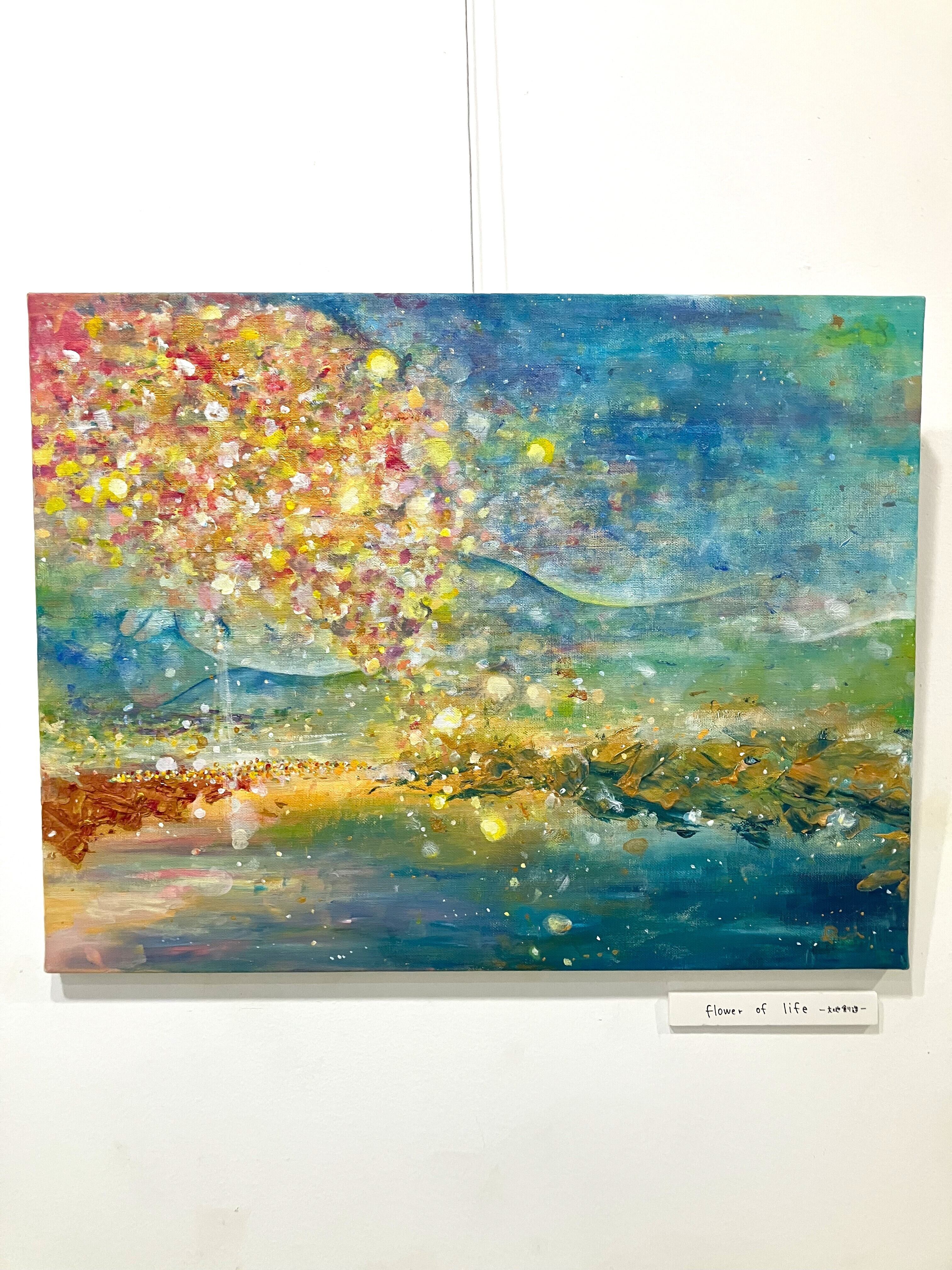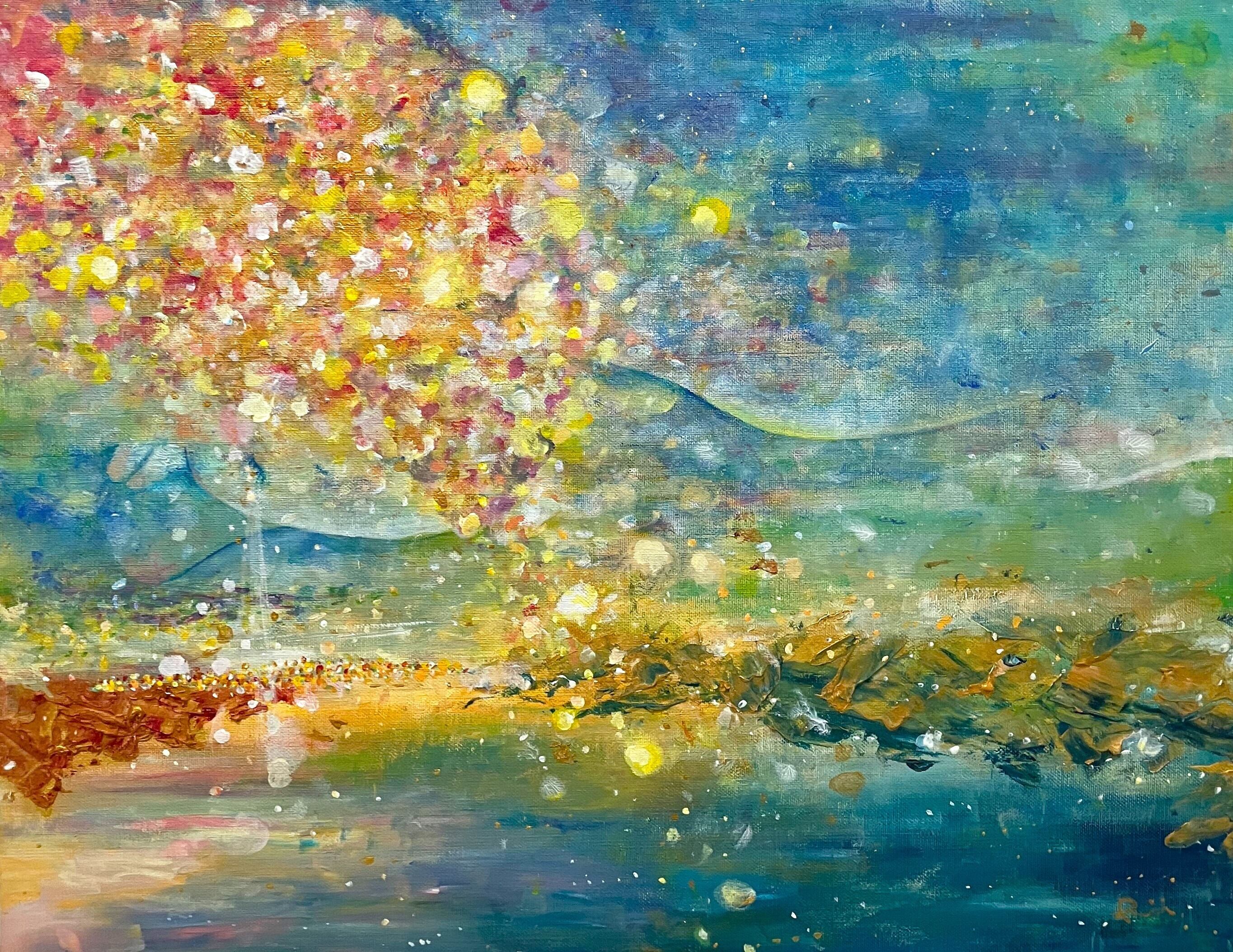 地球の始まり。大きな神様のような存在を描いています。この絵は、逆さまにしても横にしても美しく自由な作品です。生命の循環と大地の恵みを美しく表現し、自然の大いなる力を感じさせる構図は、見る人に安らぎと力強さを与えてくれます。 このアートを通じて、日常の中で自然のリズムを感じてみてはいかがでしょうか。