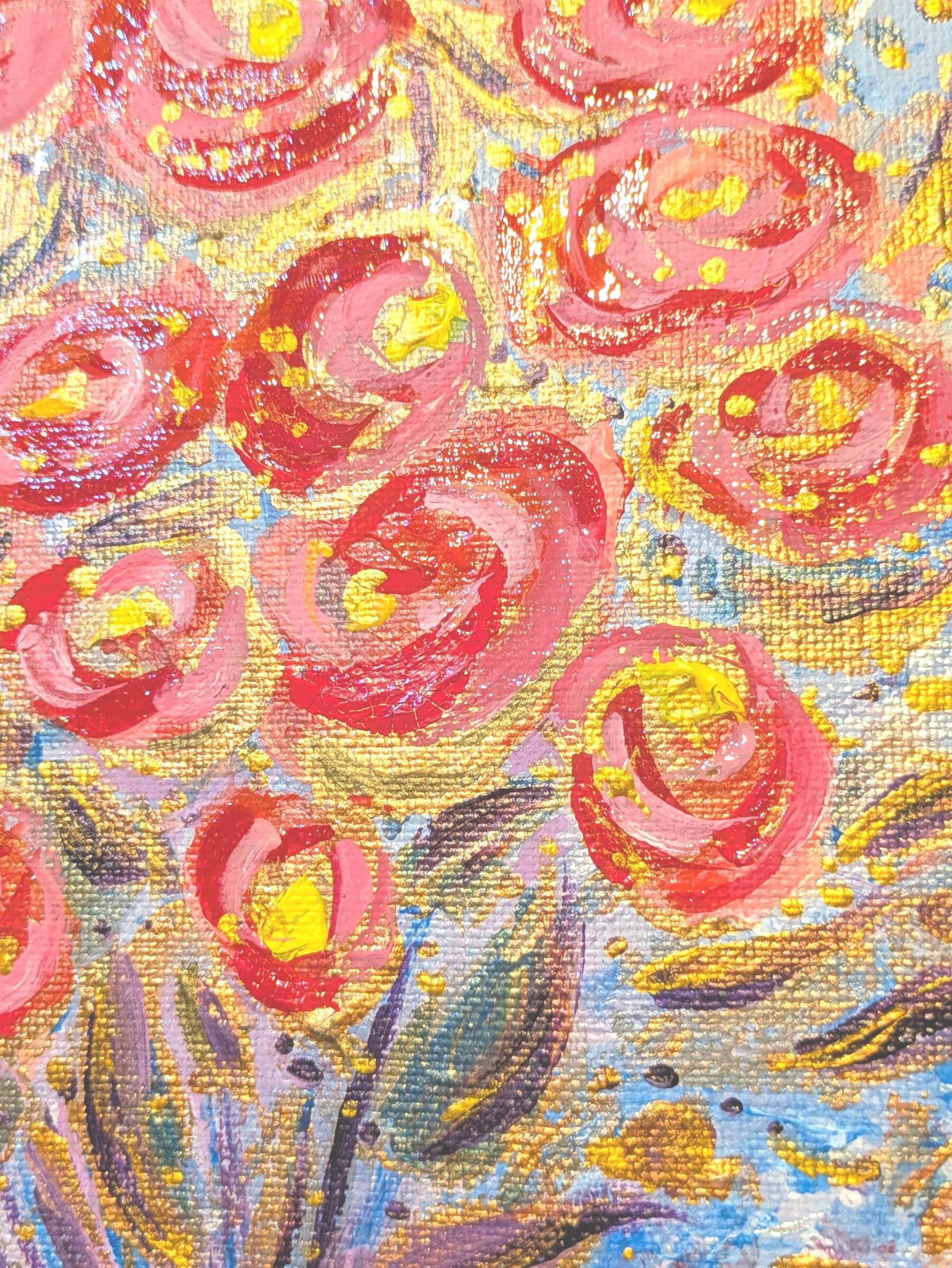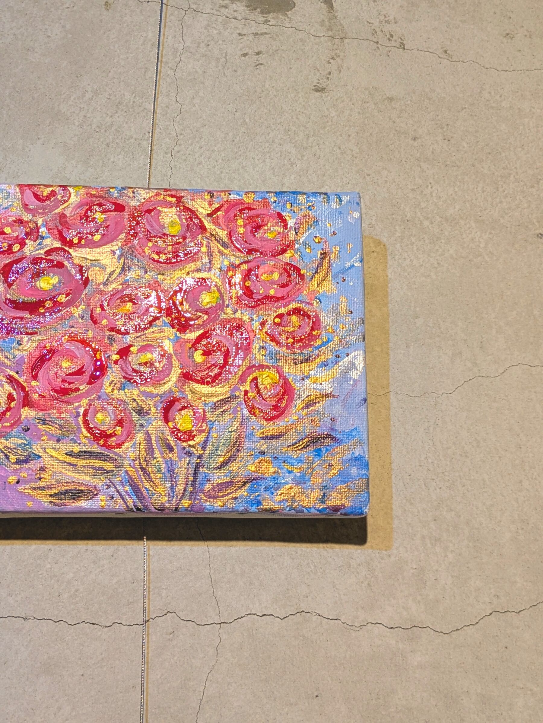 この作品は、華やかな花々を束ねたブーケを描いており、色とりどりの花が織り成す美しさで心を癒します。花の香りを感じながら、見る人々に安らぎと喜びをもたらすような一瞬を表現しています。